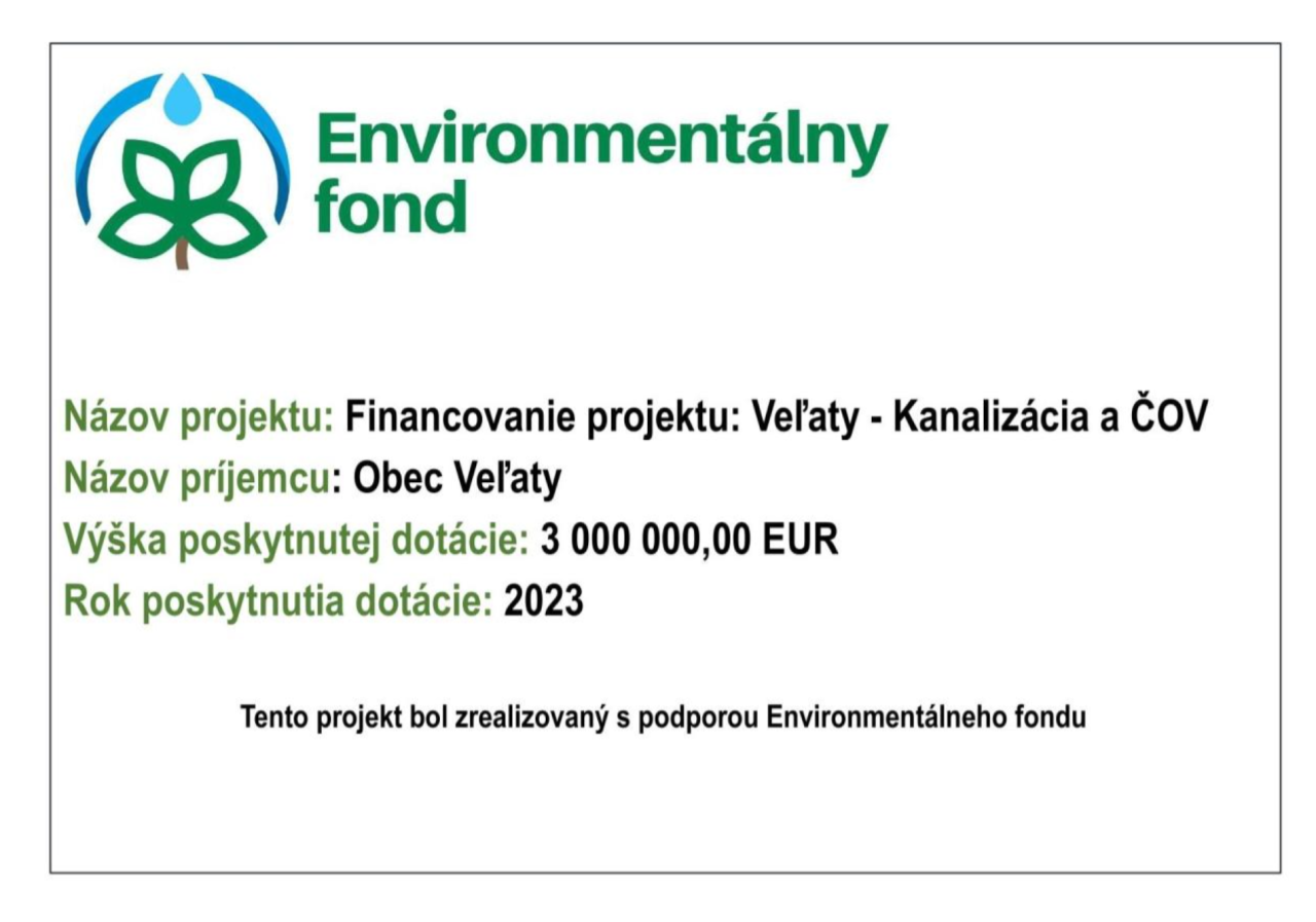 Obec Veľaty s radosťou oznamuje, že úspešne získala dotáciu vo výške 3 000 000,00 EUR na realizáciu projektu kanalizácie a čističky odpadových vôd. Tento projekt bol financovaný s podporou Environmentálneho fondu, čo prispeje k zlepšeniu infraštruktúry a ochrane životného prostredia v obci. Realizácia projektu predstavuje významný krok v oblasti environmentálnej udržateľnosti a zlepšenia kvality života obyvateľov. Obec sa teší na pozitívne dopady tohto projektu na miestnu komunitu.